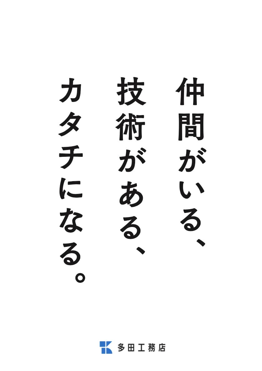 日本中、そして世界中のみんなが安心して毎日の暮らしをアタリマエに営む、本当は普通じゃないギジュツの積み重ねの先にあるそんなミライを形創っていくために。一人ではできないことも、職人一人ひとりのコセイやギジュツ、ワクワクを重ね合わせることで実現することができる。ワタシたち多田工務店は、関わるすべてのヒトやマチの持続可能なミライを「キョウソウ(共想・共創・協奏)」し続けます。