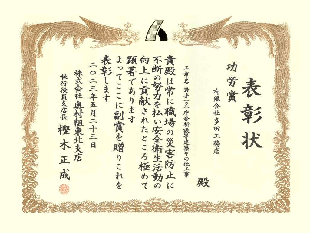 株式会社奥村組東北支店より弊社職長が功労賞を受賞しました。