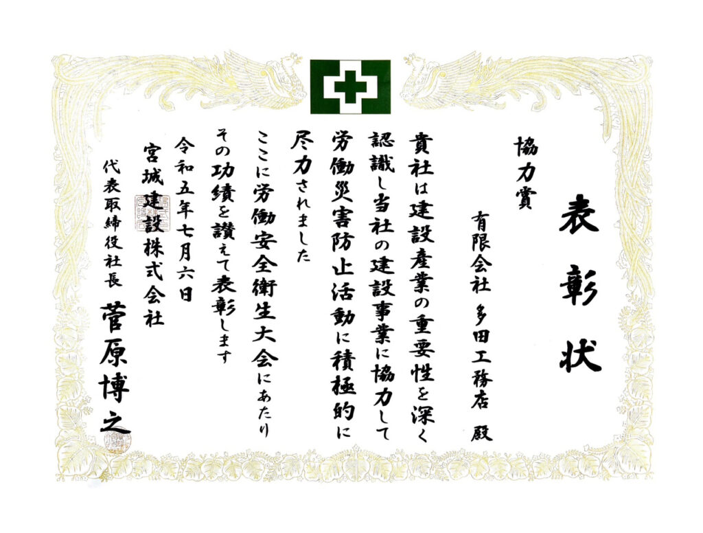宮城建設株式会社より協力賞を受賞しました